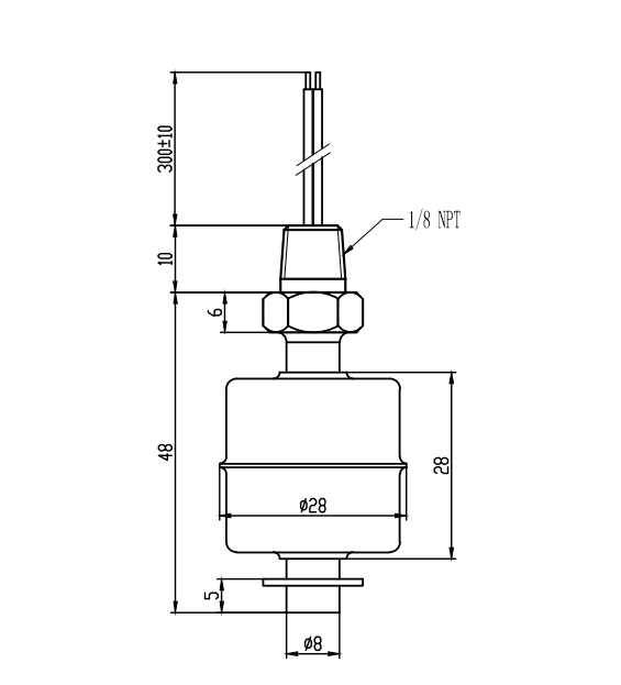 液位開關由磁簧開關和浮子組成,浮子隨被測液位上下移動時,觸動磁簧開關而檢測出液位位置。